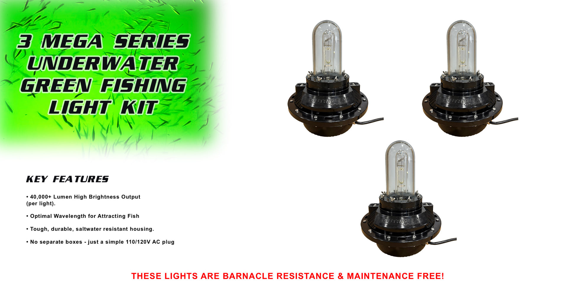 Backed by more than a decade of real-world testing and customer feedback, the Mega Series Underwater Fishing Light is engineered to withstand barnacle growth, harsh saltwater, and constant use—while attracting baitfish and gamefish better than any other system on the market.