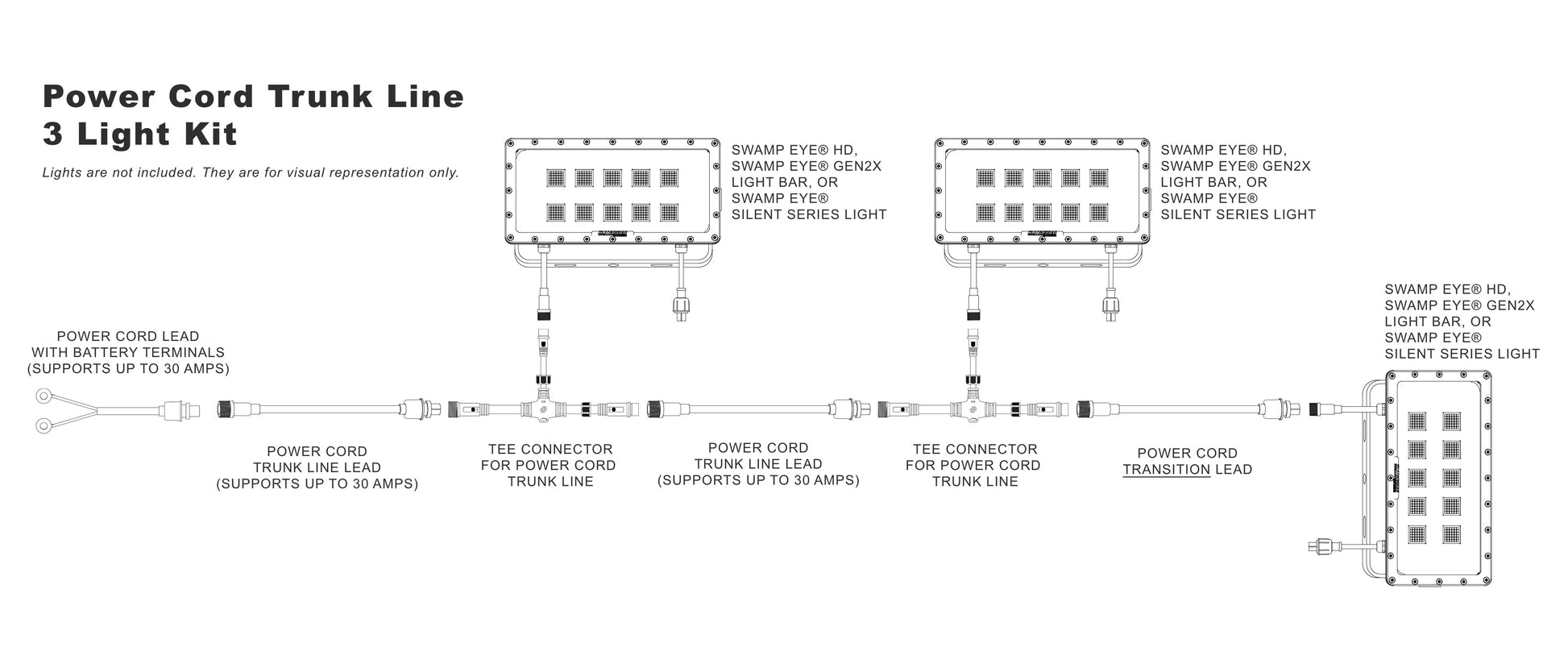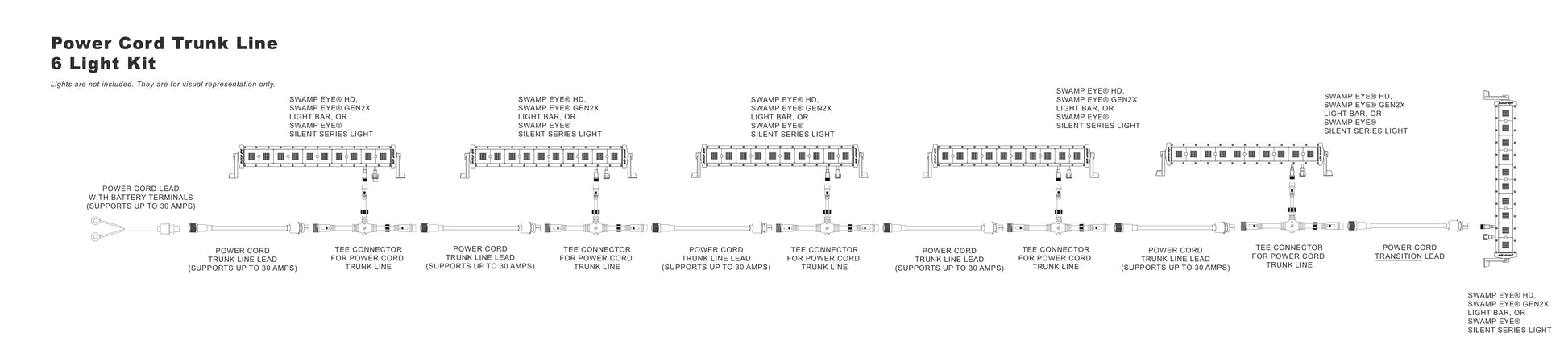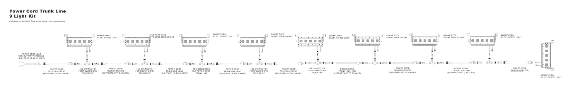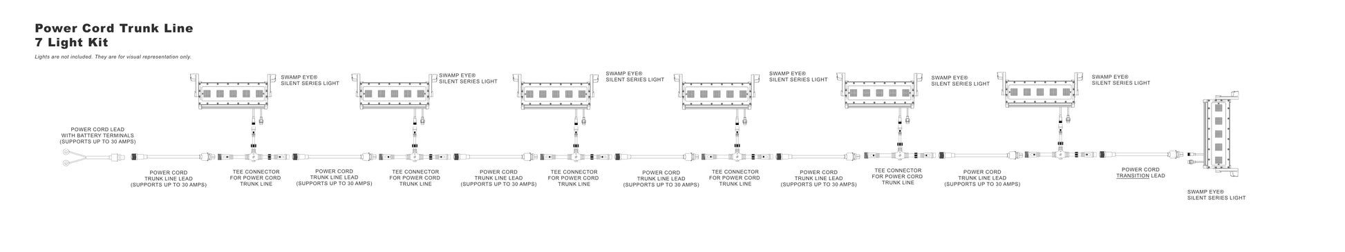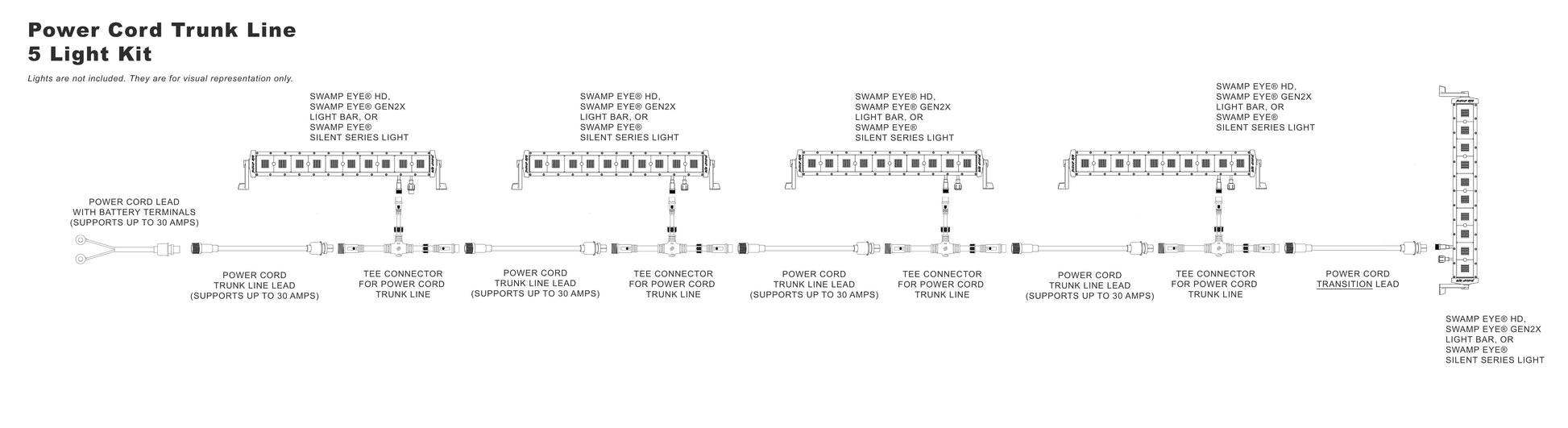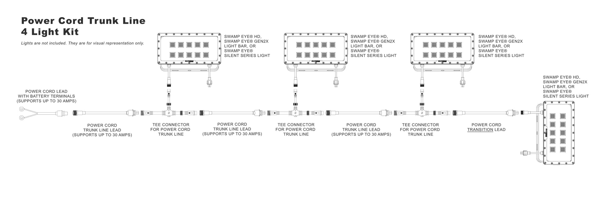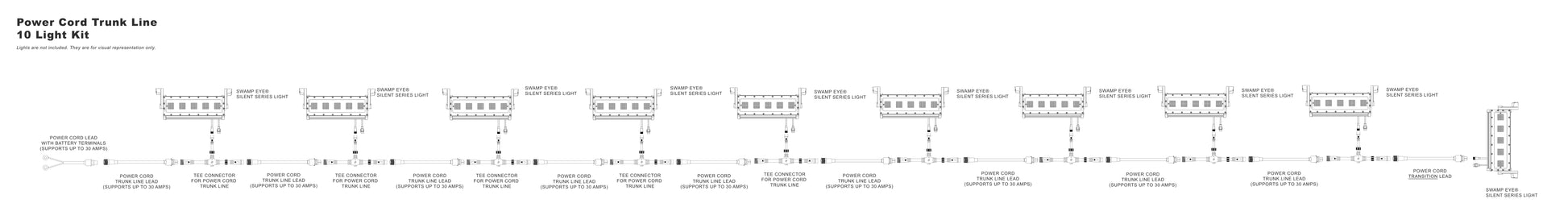 The Power Trunk Line Plug-and-Play Wiring Kit is a modular power distribution system designed to cleanly run multiple Swamp Eye® lights from a single battery bank or oversized power converter. Built from our Building Block Power Wire Harness components, this kit eliminates messy wiring while maintaining safe amp limits and reliable power delivery.
